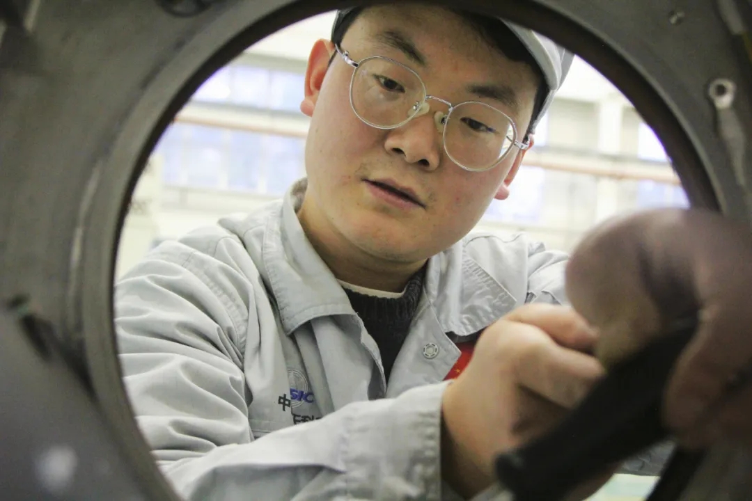 裝配車間內(nèi),負責(zé)首件產(chǎn)品艙段裝配工作的操作員楊振宇,正手持塞尺,對一部件的安裝間隙進行裝后自檢。