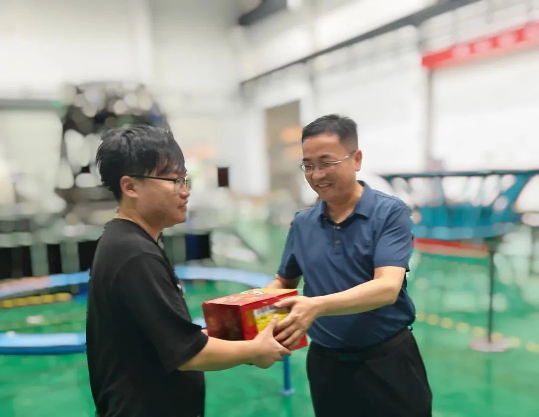 7月8日,航天三江黨委書記、董事長高輝文,黨委委員、總會計師弓興隆前往快舟產業園慰問高溫下奮戰一線的快舟試驗隊員和各項目人員。